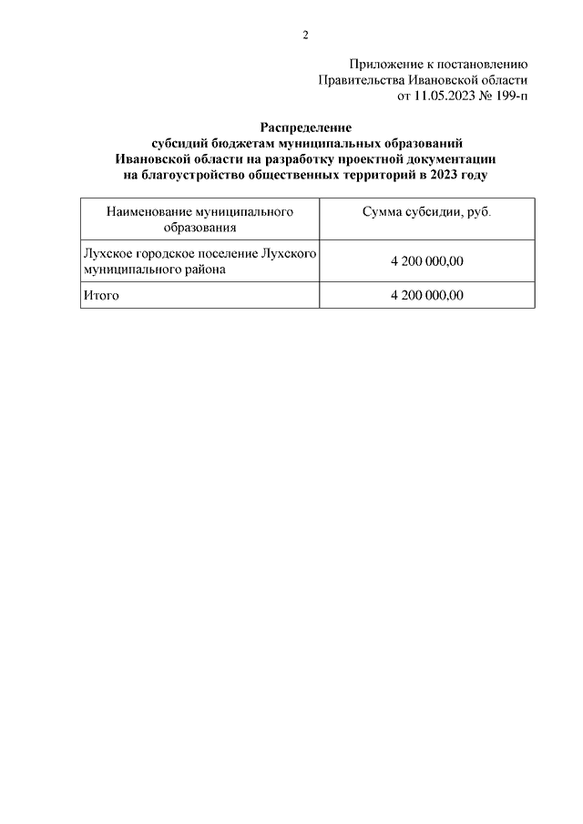 Постановление Правительства Ивановской области от 11.05.2023 N 199-п "О распределении субсидий бюджетам муниципальных образований Ивановской области на разработку проектной документации на благоустройство общественных территорий в 2023 году"
