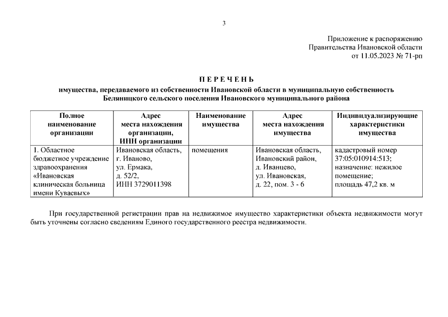 Распоряжение Правительства Ивановской области от 11.05.2023 N 71-рп "О передаче имущества из собственности Ивановской области в муниципальную собственность Беляницкого сельского поселения Ивановского муниципального района"
