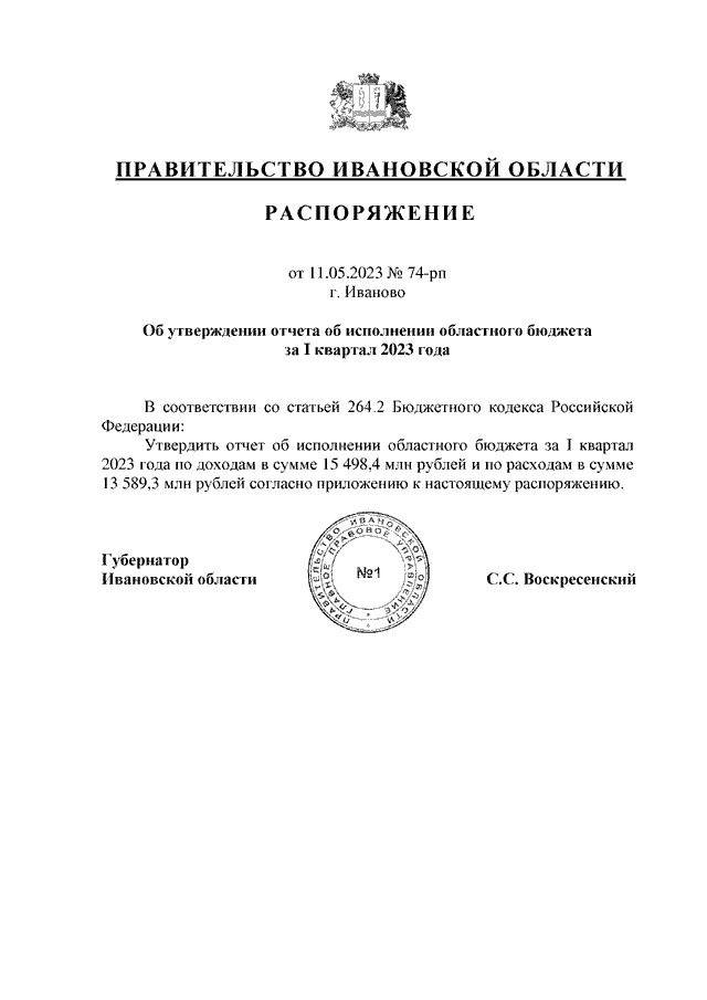 Распоряжение Правительства Ивановской области от 11.05.2023 N 74-рп "Об утверждении отчета об исполнении областного бюджета за I квартал 2023 года"