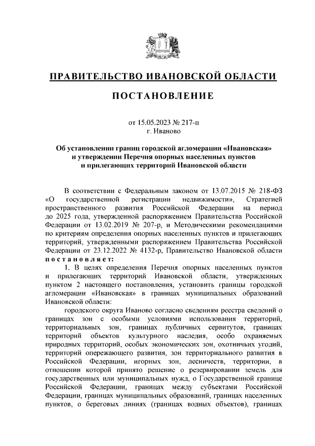 Постановление Правительства Ивановской области от 15.05.2023 N 217-п "Об установлении границ городской агломерации "Ивановская" и утверждении Перечня опорных населенных пунктов и прилегающих территорий Ивановской области"