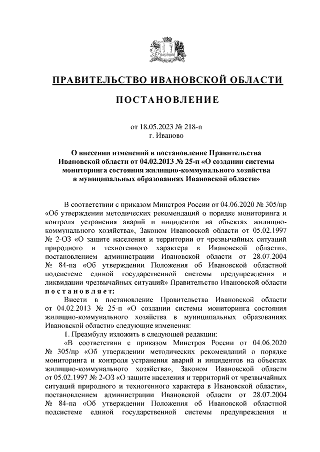 Постановление Правительства Ивановской области от 18.05.2023 N 218-п "О внесении изменений в постановление Правительства Ивановской области от 04.02.2013 N 25-п "О создании системы мониторинга состояния жилищно-коммунального хозяйства в муниципальных образованиях Ивановской области"