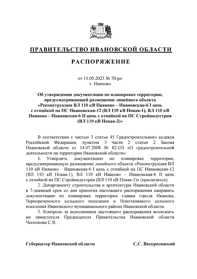 Распоряжение Правительства Ивановской области от 11.05.2023 N 70-рп "Об утверждении документации по планировке территории, предусматривающей размещение линейного объекта "Реконструкция ВЛ 110 кВ Иваново - Ивановская-6 I цепь с отпайкой на ПС Ивановская-12 (ВЛ 110 кВ Новая-1), ВЛ 110 кВ Иваново - Ивановская-6 II цепь с отпайкой на ПС Стройиндустрия (ВЛ 110 кВ Новая-2)"