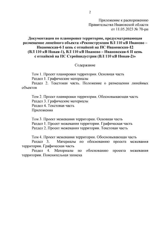 Распоряжение Правительства Ивановской области от 11.05.2023 N 70-рп "Об утверждении документации по планировке территории, предусматривающей размещение линейного объекта "Реконструкция ВЛ 110 кВ Иваново - Ивановская-6 I цепь с отпайкой на ПС Ивановская-12 (ВЛ 110 кВ Новая-1), ВЛ 110 кВ Иваново - Ивановская-6 II цепь с отпайкой на ПС Стройиндустрия (ВЛ 110 кВ Новая-2)"