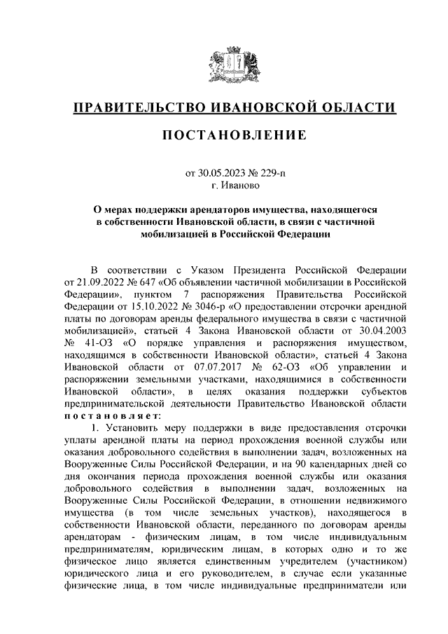 Постановление Правительства Ивановской области от 30.05.2023 N 229-п "О мерах поддержки арендаторов имущества, находящегося в собственности Ивановской области, в связи с частичной мобилизацией в Российской Федерации"
