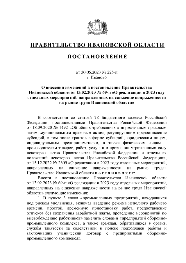 Постановление Правительства Ивановской области от 30.05.2023 N 225-п "О внесении изменений в постановление Правительства Ивановской области от 13.02.2023 N 69-п "О реализации в 2023 году отдельных мероприятий, направленных на снижение напряженности на рынке труда Ивановской области"