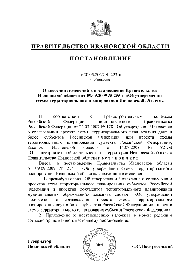 Постановление Правительства Ивановской области от 30.05.2023 N 223-п "О внесении изменений в постановление Правительства Ивановской области от 09.09.2009 N 255-п "Об утверждении схемы территориального планирования Ивановской области"