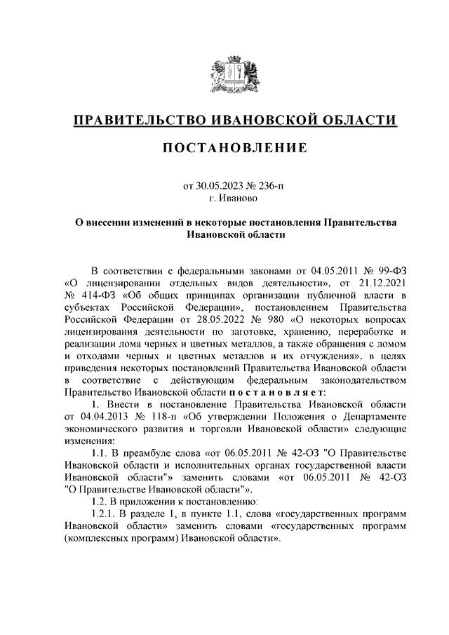 Постановление Правительства Ивановской области от 30.05.2023 N 236-п "О внесении изменений в некоторые постановления Правительства Ивановской области"
