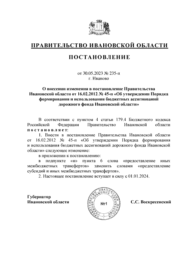 Постановление Правительства Ивановской области от 30.05.2023 N 235-п "О внесении изменения в постановление Правительства Ивановской области от 16.02.2012 N 45-п "Об утверждении Порядка формирования и использования бюджетных ассигнований дорожного фонда Ивановской области"