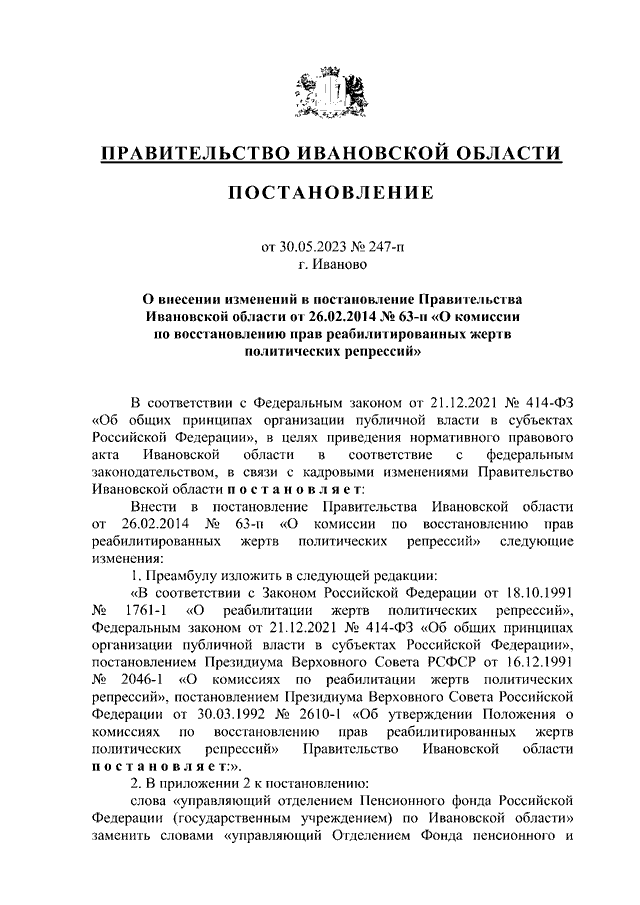 Постановление Правительства Ивановской области от 30.05.2023 N 247-п "О внесении изменений в постановление Правительства Ивановской области от 26.02.2014 N 63-п "О комиссии по восстановлению прав реабилитированных жертв политических репрессий"