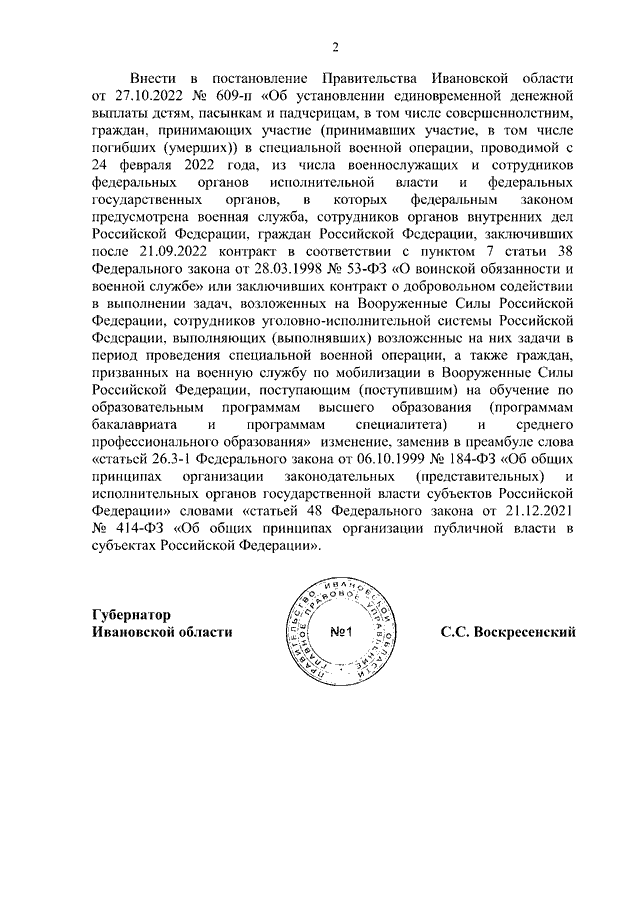 Постановление Правительства Ивановской области от 30.05.2023 N 245-п "О внесении изменения в постановление Правительства Ивановской области от 27.10.2022 N 609-п "Об установлении единовременной денежной выплаты детям, пасынкам и падчерицам, в том числе совершеннолетним, граждан, принимающих участие (принимавших участие, в том числе погибших (умерших)) в специальной военной операции, проводимой с 24 февраля 2022 года, из числа военнослужащих и сотрудников федеральных органов исполнительной власти и федеральных государственных органов, в которых федеральным законом предусмотрена военная служба, сотрудников органов внутренних дел Российской Федерации, граждан Российской Федерации, заключивших после 21.09.2022 контракт в соответствии с пунктом 7 статьи 38 Федерального закона от 28.03.1998 N 53-ФЗ "О воинской обязанности и военной службе" или заключивших контракт о добровольном содействии в выполнении задач, возложенных на Вооруженные Силы Российской Федерации, сотрудников уголовно-исполнительной системы Российской Федерации, выполняющих (выполнявших) возложенные на них задачи в период проведения специальной военной операции, а также граждан, призванных на военную службу по мобилизации в Вооруженные Силы Российской Федерации, поступающим (поступившим) на обучение по образовательным программам высшего образования (программам бакалавриата и программам специалитета) и среднего профессионального образования"
