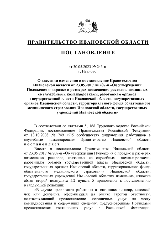 Постановление Правительства Ивановской области от 30.05.2023 N 243-п "О внесении изменения в постановление Правительства Ивановской области от 23.05.2017 N 207-п "Об утверждении Положения о порядке и размерах возмещения расходов, связанных со служебными командировками, работникам органов государственной власти Ивановской области, государственных органов Ивановской области, территориального фонда обязательного медицинского страхования Ивановской области, государственных учреждений Ивановской области"