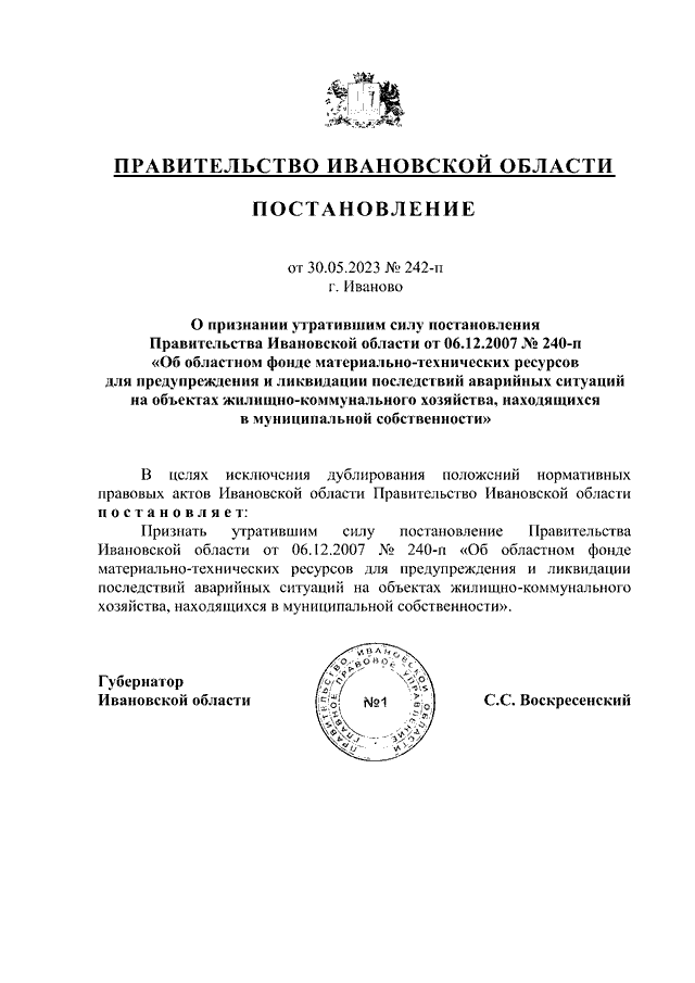 Постановление Правительства Ивановской области от 30.05.2023 N 242-п "О признании утратившим силу постановления Правительства Ивановской области от 06.12.2007 N 240-п "Об областном фонде материально-технических ресурсов для предупреждения и ликвидации последствий аварийных ситуаций на объектах жилищно-коммунального хозяйства, находящихся в муниципальной собственности"