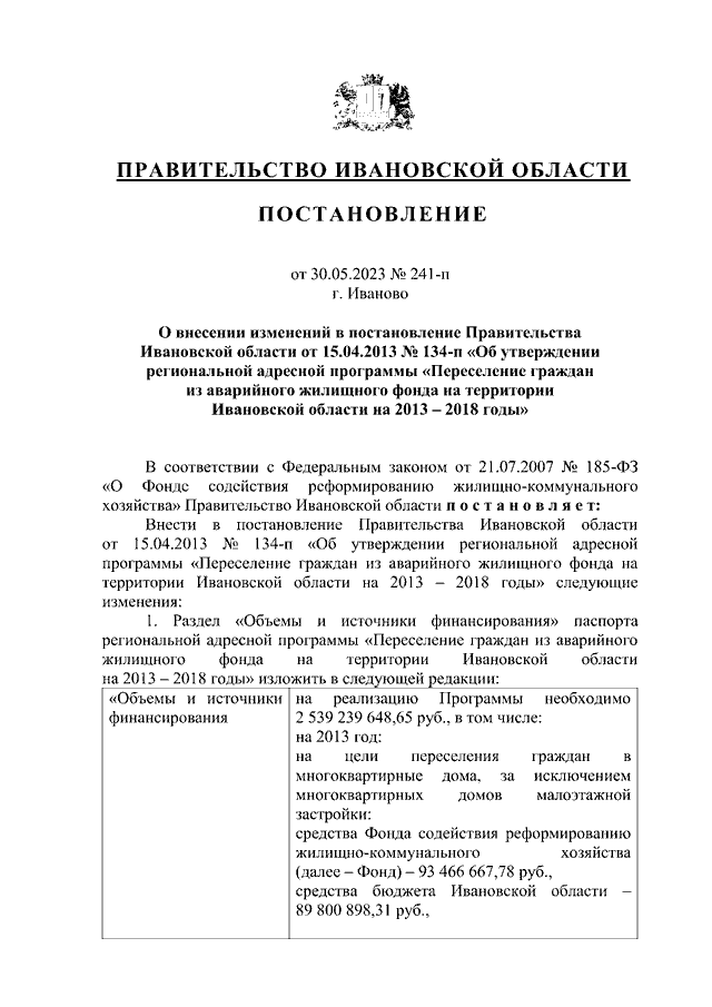 Постановление Правительства Ивановской области от 30.05.2023 N 241-п "О внесении изменений в постановление Правительства Ивановской области от 15.04.2013 N 134-п "Об утверждении региональной адресной программы "Переселение граждан из аварийного жилищного фонда на территории Ивановской области на 2013 - 2018 годы" (вместе с "Перечнем аварийных многоквартирных домов, из которых граждане подлежат переселению в многоквартирные дома, в том числе отнесенные к домам малоэтажной застройки")