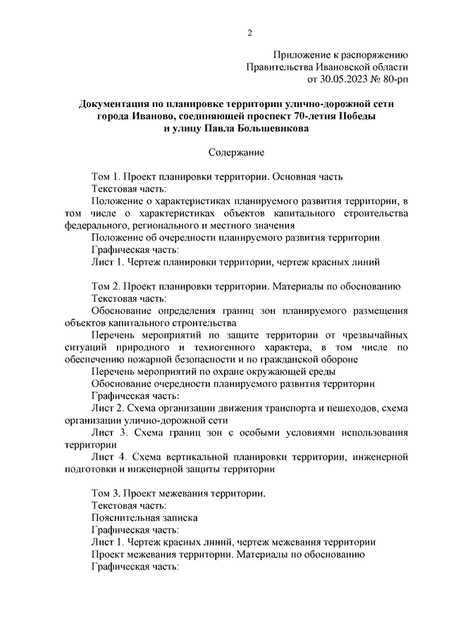 Распоряжение Правительства Ивановской области от 30.05.2023 N 80-рп "Об утверждении документации по планировке территории улично-дорожной сети города Иваново, соединяющей проспект 70-летия Победы и улицу Павла Большевикова"