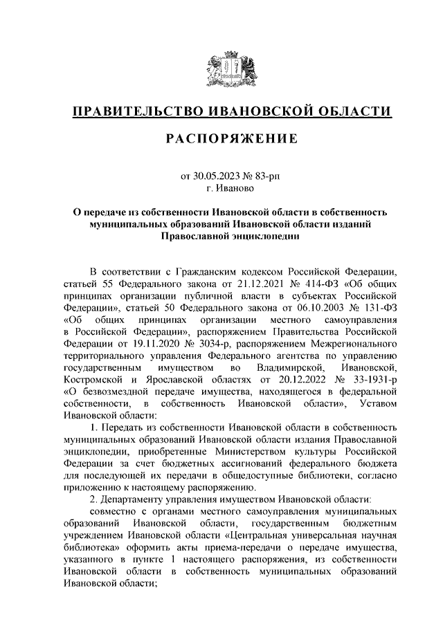 Распоряжение Правительства Ивановской области от 30.05.2023 N 83-рп "О передаче из собственности Ивановской области в собственность муниципальных образований Ивановской области изданий Православной энциклопедии"