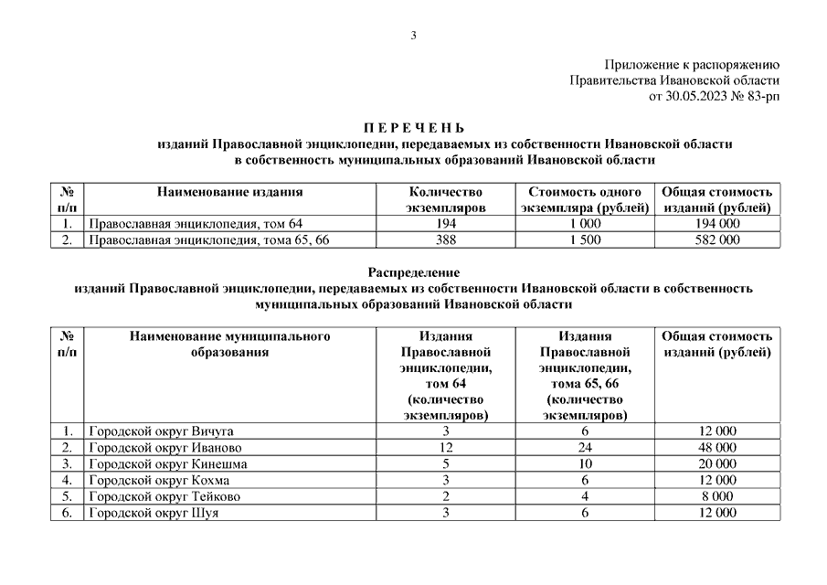 Распоряжение Правительства Ивановской области от 30.05.2023 N 83-рп "О передаче из собственности Ивановской области в собственность муниципальных образований Ивановской области изданий Православной энциклопедии"