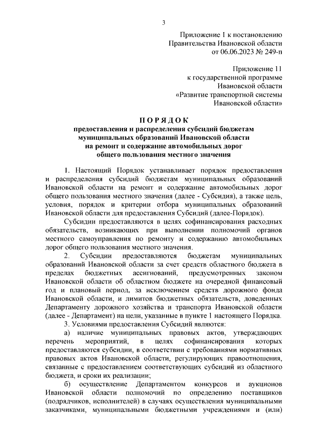 Постановление Правительства Ивановской области от 06.06.2023 N 249-п "О внесении изменений в постановление Правительства Ивановской области от 13.11.2013 N 447-п "Об утверждении государственной программы Ивановской области "Развитие транспортной системы Ивановской области" (вместе с "Порядком предоставления и распределения субсидий бюджетам муниципальных образований Ивановской области на ремонт и содержание автомобильных дорог общего пользования местного значения")