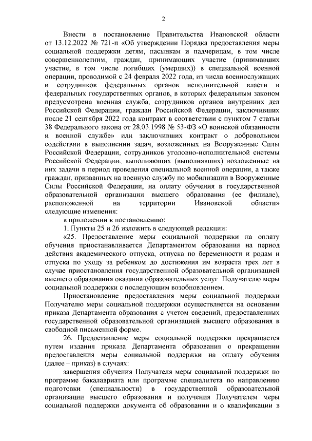 Постановление Правительства Ивановской области от 07.06.2023 N 250-п "О внесении изменений в постановление Правительства Ивановской области от 13.12.2022 N 721-п "Об утверждении Порядка предоставления меры социальной поддержки детям, пасынкам и падчерицам, в том числе совершеннолетним, граждан, принимающих участие (принимавших участие, в том числе погибших (умерших)) в специальной военной операции, проводимой с 24 февраля 2022 года, из числа военнослужащих и сотрудников федеральных органов исполнительной власти и федеральных государственных органов, в которых федеральным законом предусмотрена военная служба, сотрудников органов внутренних дел Российской Федерации, граждан Российской Федерации, заключивших после 21 сентября 2022 года контракт в соответствии с пунктом 7 статьи 38 Федерального закона от 28.03.1998 N 53-ФЗ "О воинской обязанности и военной службе" или заключивших контракт о добровольном содействии в выполнении задач, возложенных на Вооруженные Силы Российской Федерации, сотрудников уголовно-исполнительной системы Российской Федерации, выполняющих (выполнявших) возложенные на них задачи в период проведения специальной военной операции, а также граждан, призванных на военную службу по мобилизации в Вооруженные Силы Российской Федерации, на оплату обучения в государственной образовательной организации высшего образования (ее филиале), расположенной на территории Ивановской области"