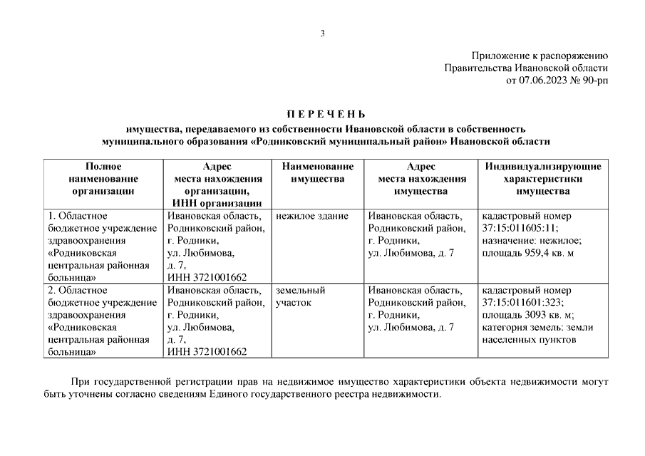 Распоряжение Правительства Ивановской области от 07.06.2023 N 90-рп "О передаче имущества из собственности Ивановской области в собственность муниципального образования "Родниковский муниципальный район" Ивановской области"