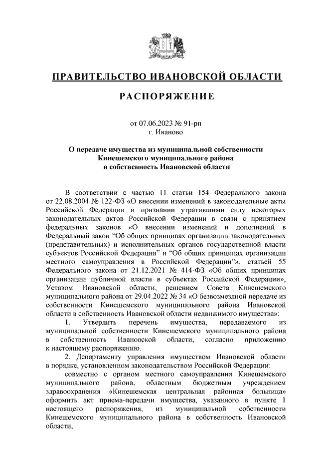 Распоряжение Правительства Ивановской области от 07.06.2023 N 91-рп "О передаче имущества из муниципальной собственности Кинешемского муниципального района в собственность Ивановской области"