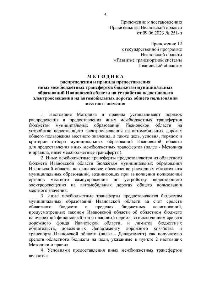 Постановление Правительства Ивановской области от 09.06.2023 N 251-п "О внесении изменений в постановление Правительства Ивановской области от 13.11.2013 N 447-п "Об утверждении государственной программы Ивановской области "Развитие транспортной системы Ивановской области" (вместе с "Методикой распределения и правилами предоставления иных межбюджетных трансфертов бюджетам муниципальных образований Ивановской области на устройство недостающего электроосвещения на автомобильных дорогах общего пользования местного значения")