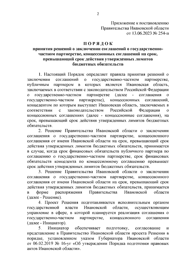 Постановление Правительства Ивановской области от 13.06.2023 N 254-п "Об утверждении Порядка принятия решений о заключении соглашений о государственно-частном партнерстве, концессионных соглашений на срок, превышающий срок действия утвержденных лимитов бюджетных обязательств"