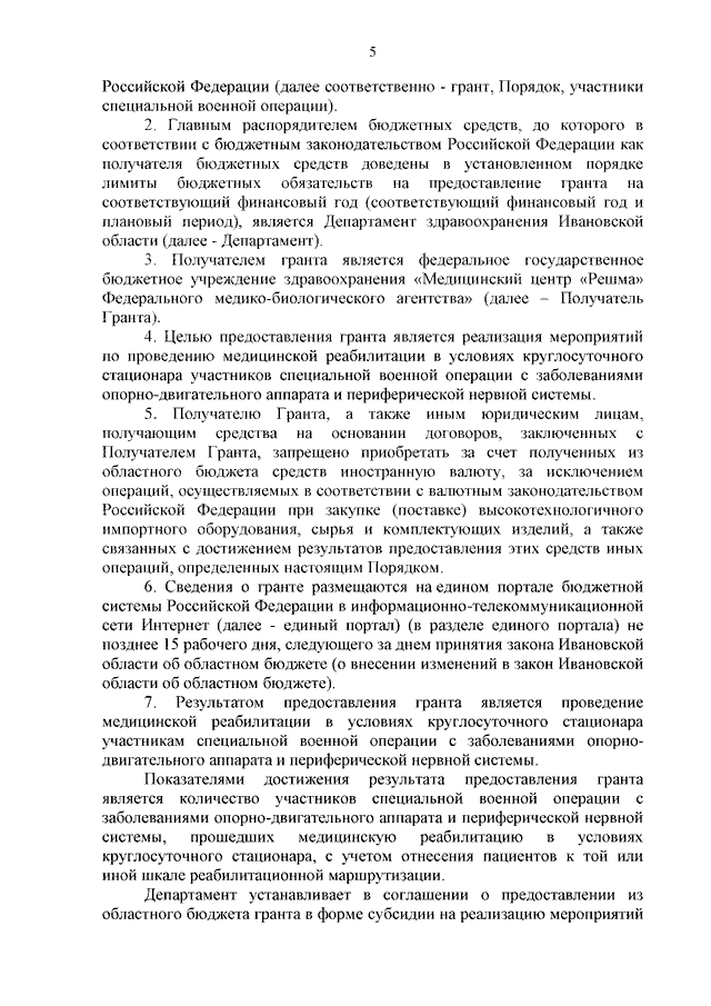 Постановление Правительства Ивановской области от 19.06.2023 N 255-п "О реализации в 2023 году мероприятий по проведению медицинской реабилитации граждан, принимающих участие (принимавших участие) в специальной военной операции, проводимой с 24.02.2022" (вместе с "Порядком предоставления из областного бюджета гранта в форме субсидии на реализацию мероприятий по проведению медицинской реабилитации граждан, принимающих участие (принимавших участие) в специальной военной операции, проводимой с 24.02.2022, из числа военнослужащих и сотрудников федеральных органов исполнительной власти и федеральных государственных органов, в которых федеральным законом предусмотрена военная служба, сотрудников органов внутренних дел Российской Федерации, граждан Российской Федерации, заключивших после 21.09.2022 контракт в соответствии с пунктом 7 статьи 38 Федерального закона от 28.03.1998 N 53-ФЗ "О воинской обязанности и военной службе" или заключивших контракт о добровольном содействии в выполнении задач, возложенных на Вооруженные Силы Российской Федерации, сотрудников уголовно-исполнительной системы Российской Федерации, выполняющих (выполнявших) возложенные на них задачи в период проведения специальной военной операции, а также граждан, призванных на военную службу по мобилизации в Вооруженные Силы Российской Федерации, в 2023 году")