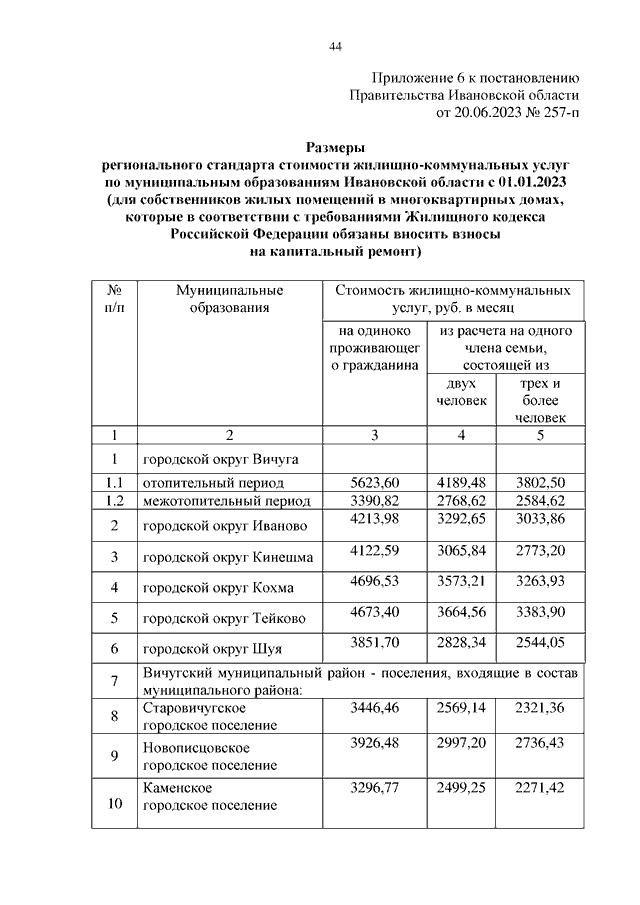 Постановление Правительства Ивановской области от 20.06.2023 N 257-п "Об установлении размеров региональных стандартов стоимости жилищно-коммунальных услуг"