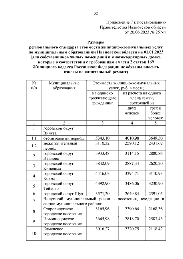 Постановление Правительства Ивановской области от 20.06.2023 N 257-п "Об установлении размеров региональных стандартов стоимости жилищно-коммунальных услуг"
