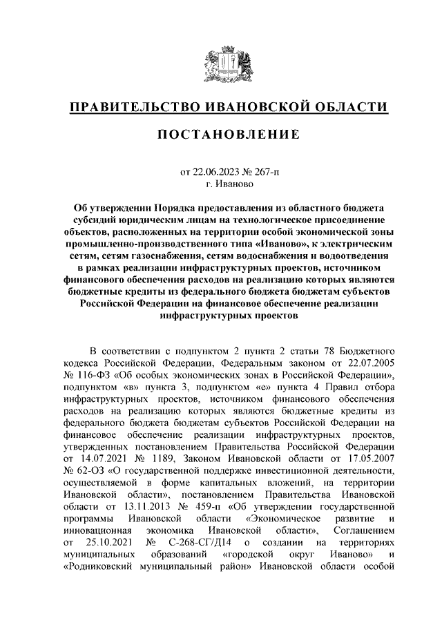 Постановление Правительства Ивановской области от 22.06.2023 N 267-п "Об утверждении Порядка предоставления из областного бюджета субсидий юридическим лицам на технологическое присоединение объектов, расположенных на территории особой экономической зоны промышленно-производственного типа "Иваново", к электрическим сетям, сетям газоснабжения, сетям водоснабжения и водоотведения в рамках реализации инфраструктурных проектов, источником финансового обеспечения расходов на реализацию которых являются бюджетные кредиты из федерального бюджета бюджетам субъектов Российской Федерации на финансовое обеспечение реализации инфраструктурных проектов"