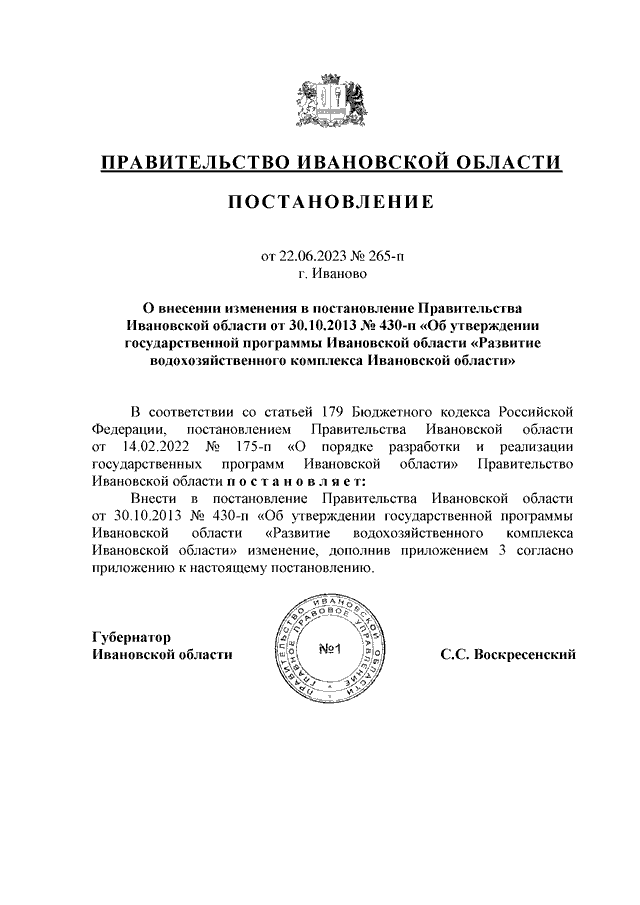 Постановление Правительства Ивановской области от 22.06.2023 N 265-п "О внесении изменения в постановление Правительства Ивановской области от 30.10.2013 N 430-п "Об утверждении государственной программы Ивановской области "Развитие водохозяйственного комплекса Ивановской области" (вместе с "Порядком предоставления и распределения субсидий бюджетам муниципальных образований Ивановской области на разработку (корректировку) проектной документации на реконструкцию, капитальный ремонт объектов инженерной защиты")