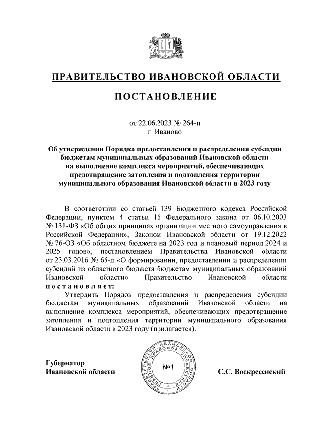 Постановление Правительства Ивановской области от 22.06.2023 N 264-п "Об утверждении Порядка предоставления и распределения субсидии бюджетам муниципальных образований Ивановской области на выполнение комплекса мероприятий, обеспечивающих предотвращение затопления и подтопления территории муниципального образования Ивановской области в 2023 году"