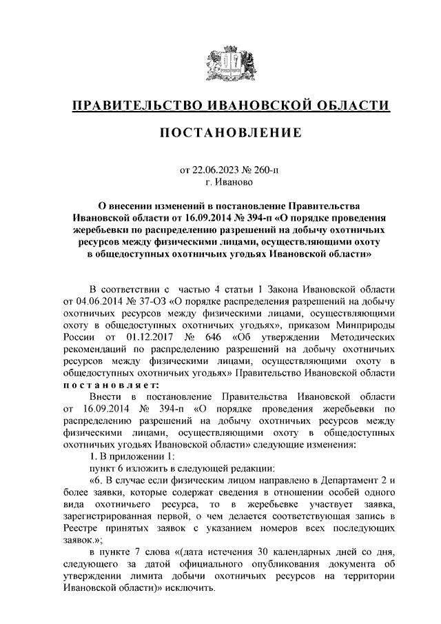 Постановление Правительства Ивановской области от 22.06.2023 N 260-п "О внесении изменений в постановление Правительства Ивановской области от 16.09.2014 N 394-п "О порядке проведения жеребьевки по распределению разрешений на добычу охотничьих ресурсов между физическими лицами, осуществляющими охоту в общедоступных охотничьих угодьях Ивановской области"