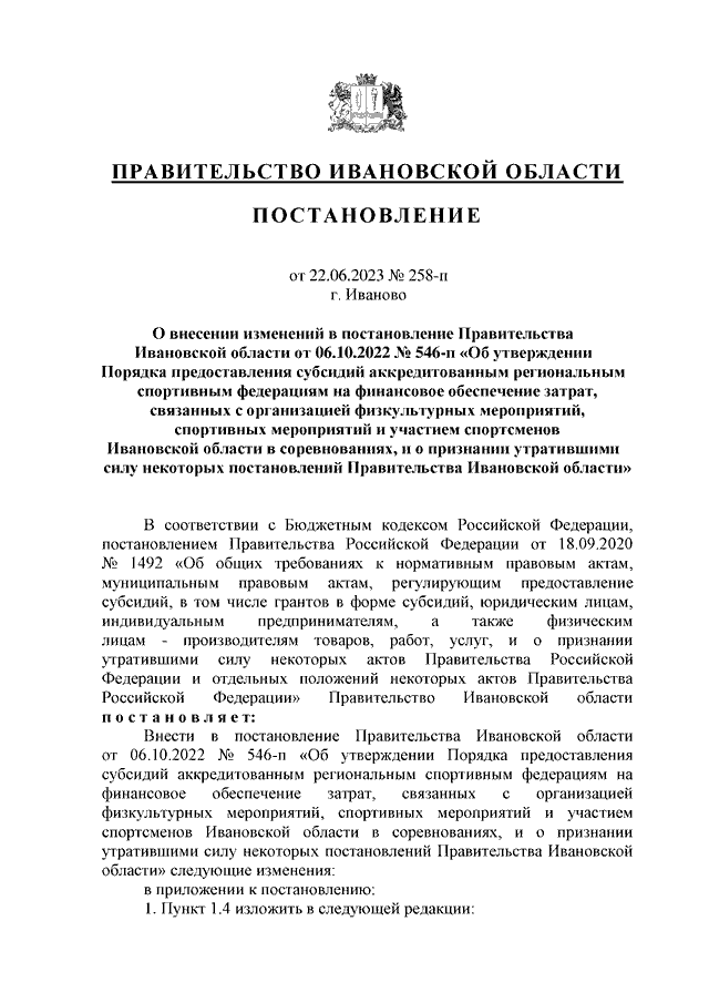 Постановление Правительства Ивановской области от 22.06.2023 N 258-п "О внесении изменений в постановление Правительства Ивановской области от 06.10.2022 N 546-п "Об утверждении Порядка предоставления субсидий аккредитованным региональным спортивным федерациям на финансовое обеспечение затрат, связанных с организацией физкультурных мероприятий, спортивных мероприятий и участием спортсменов Ивановской области в соревнованиях, и о признании утратившими силу некоторых постановлений Правительства Ивановской области"