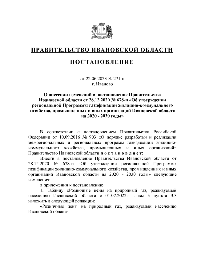 Постановление Правительства Ивановской области от 22.06.2023 N 271-п "О внесении изменений в постановление Правительства Ивановской области от 28.12.2020 N 678-п "Об утверждении региональной Программы газификации жилищно-коммунального хозяйства, промышленных и иных организаций Ивановской области на 2020 - 2030 годы" (вместе со "Сводным планом-графиком догазификации", "Пообъектным планом-графиком догазификации")