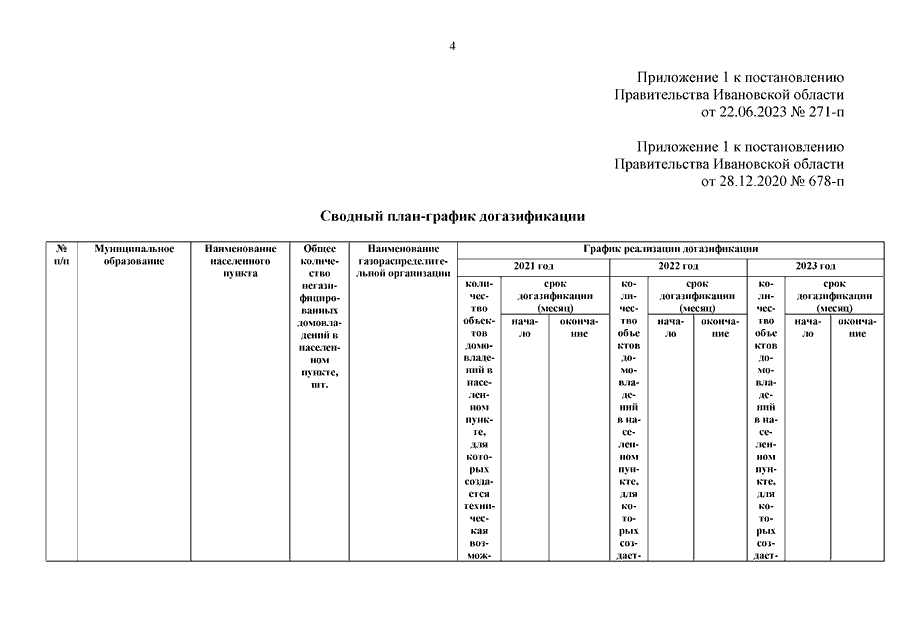 Постановление Правительства Ивановской области от 22.06.2023 N 271-п "О внесении изменений в постановление Правительства Ивановской области от 28.12.2020 N 678-п "Об утверждении региональной Программы газификации жилищно-коммунального хозяйства, промышленных и иных организаций Ивановской области на 2020 - 2030 годы" (вместе со "Сводным планом-графиком догазификации", "Пообъектным планом-графиком догазификации")