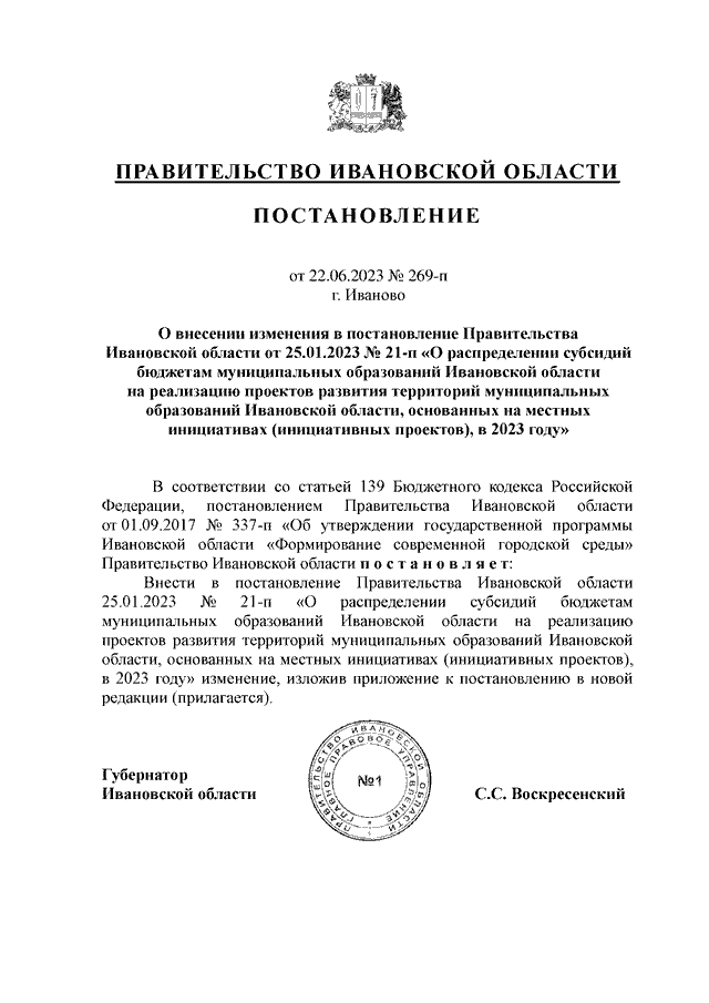 Постановление Правительства Ивановской области от 22.06.2023 N 269-п "О внесении изменения в постановление Правительства Ивановской области от 25.01.2023 N 21-п "О распределении субсидий бюджетам муниципальных образований Ивановской области на реализацию проектов развития территорий муниципальных образований Ивановской области, основанных на местных инициативах (инициативных проектов), в 2023 году"