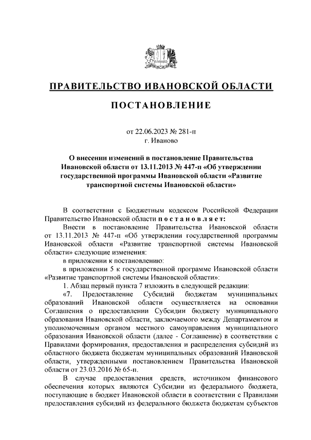 Постановление Правительства Ивановской области от 22.06.2023 N 281-п "О внесении изменений в постановление Правительства Ивановской области от 13.11.2013 N 447-п "Об утверждении государственной программы Ивановской области "Развитие транспортной системы Ивановской области"