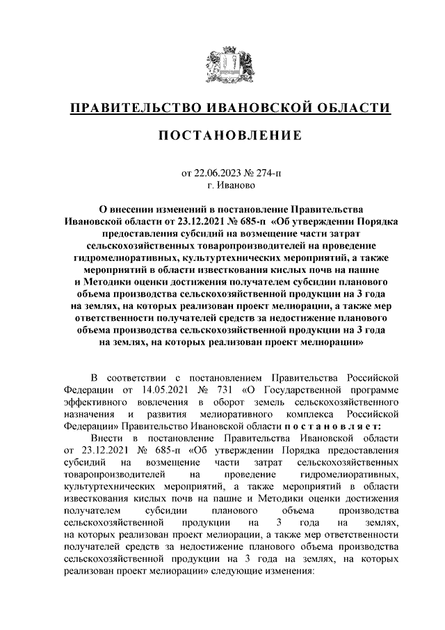 Постановление Правительства Ивановской области от 22.06.2023 N 274-п "О внесении изменений в постановление Правительства Ивановской области от 23.12.2021 N 685-п "Об утверждении Порядка предоставления субсидий на возмещение части затрат сельскохозяйственных товаропроизводителей на проведение гидромелиоративных, культуртехнических мероприятий, а также мероприятий в области известкования кислых почв на пашне и Методики оценки достижения получателем субсидии планового объема производства сельскохозяйственной продукции на 3 года на землях, на которых реализован проект мелиорации, а также мер ответственности получателей средств за недостижение планового объема производства сельскохозяйственной продукции на 3 года на землях, на которых реализован проект мелиорации"