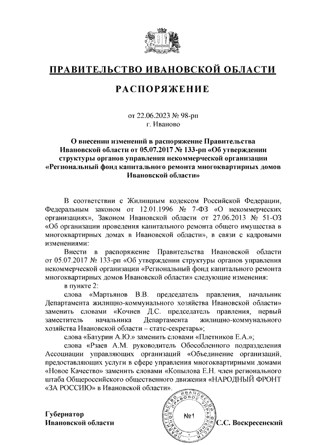 Распоряжение Правительства Ивановской области от 22.06.2023 N 98-рп "О внесении изменений в распоряжение Правительства Ивановской области от 05.07.2017 N 133-рп "Об утверждении структуры органов управления некоммерческой организации "Региональный фонд капитального ремонта многоквартирных домов Ивановской области"