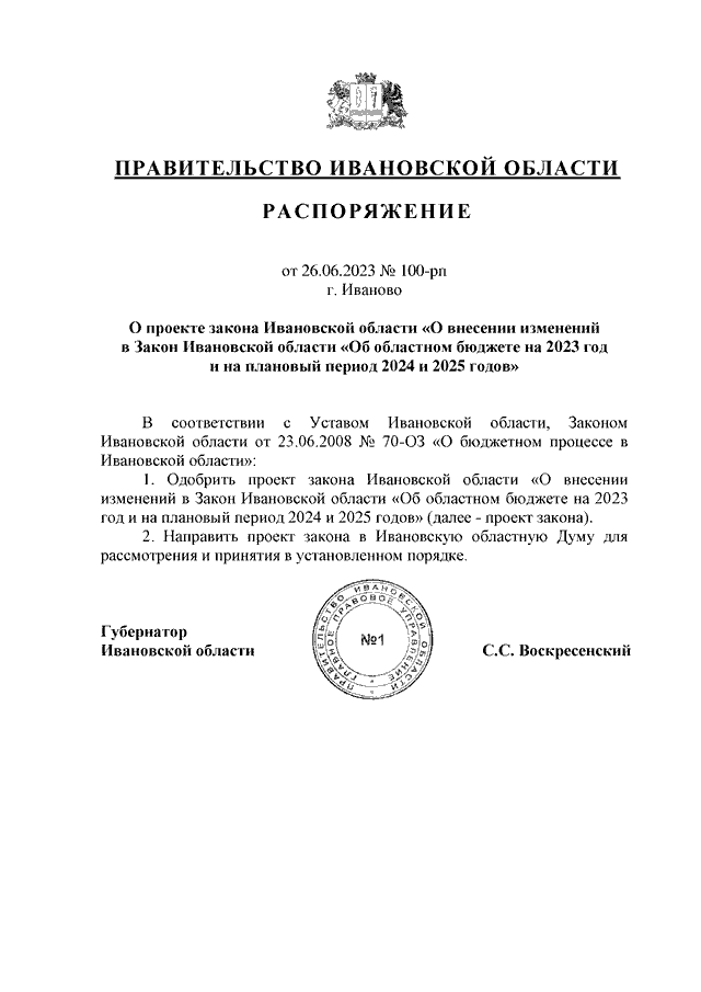Распоряжение Правительства Ивановской области от 26.06.2023 N 100-рп "О проекте закона Ивановской области "О внесении изменений в Закон Ивановской области "Об областном бюджете на 2023 год и на плановый период 2024 и 2025 годов"