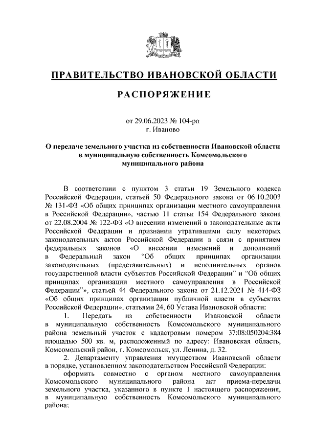 Распоряжение Правительства Ивановской области от 29.06.2023 N 104-рп "О передаче земельного участка из собственности Ивановской области в муниципальную собственность Комсомольского муниципального района"