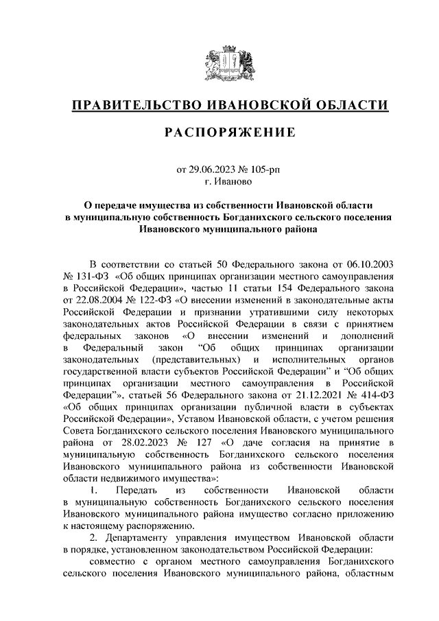 Распоряжение Правительства Ивановской области от 29.06.2023 N 105-рп "О передаче имущества из собственности Ивановской области в муниципальную собственность Богданихского сельского поселения Ивановского муниципального района"