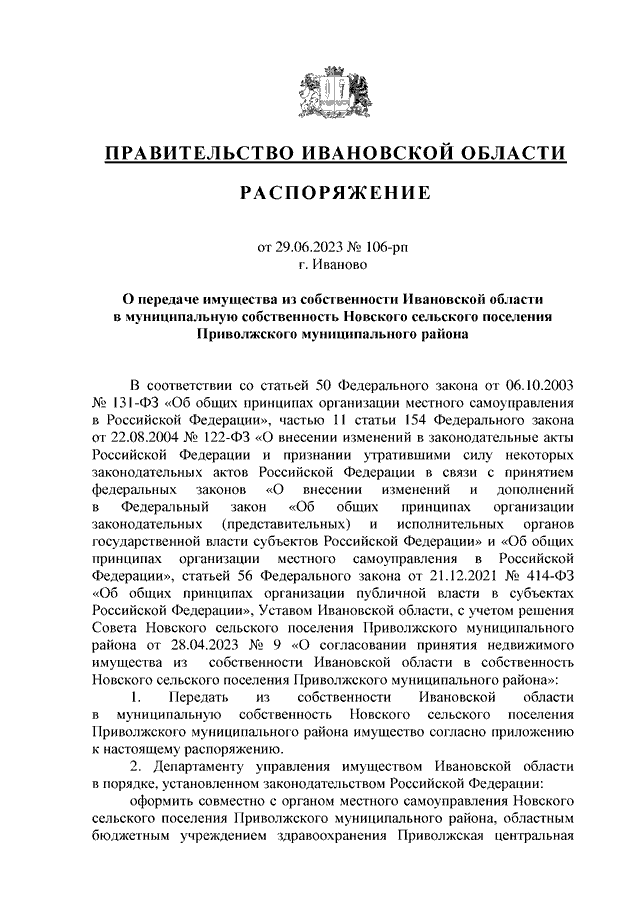 Распоряжение Правительства Ивановской области от 29.06.2023 N 106-рп "О передаче имущества из собственности Ивановской области в муниципальную собственность Новского сельского поселения Приволжского муниципального района"
