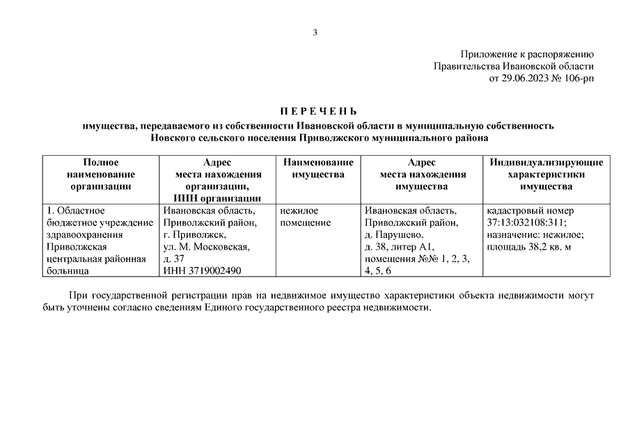 Распоряжение Правительства Ивановской области от 29.06.2023 N 106-рп "О передаче имущества из собственности Ивановской области в муниципальную собственность Новского сельского поселения Приволжского муниципального района"