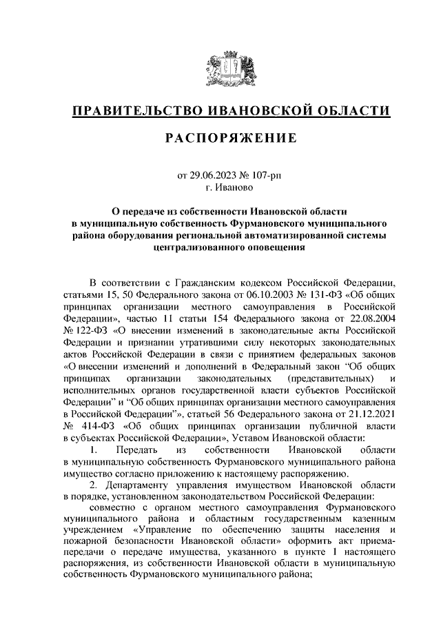 Распоряжение Правительства Ивановской области от 29.06.2023 N 107-рп "О передаче из собственности Ивановской области в муниципальную собственность Фурмановского муниципального района оборудования региональной автоматизированной системы централизованного оповещения"