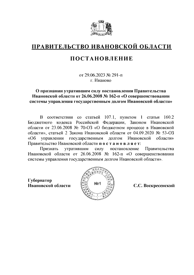 Постановление Правительства Ивановской области от 29.06.2023 N 291-п "О признании утратившим силу постановления Правительства Ивановской области от 26.06.2008 N 162-п "О совершенствовании системы управления государственным долгом Ивановской области"