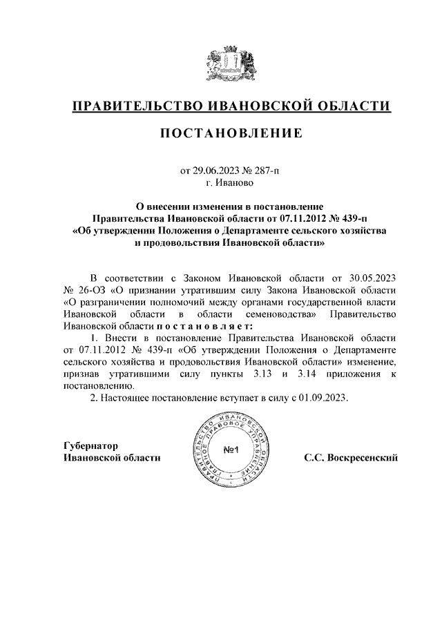 Постановление Правительства Ивановской области от 29.06.2023 N 287-п "О внесении изменения в постановление Правительства Ивановской области от 07.11.2012 N 439-п "Об утверждении Положения о Департаменте сельского хозяйства и продовольствия Ивановской области"