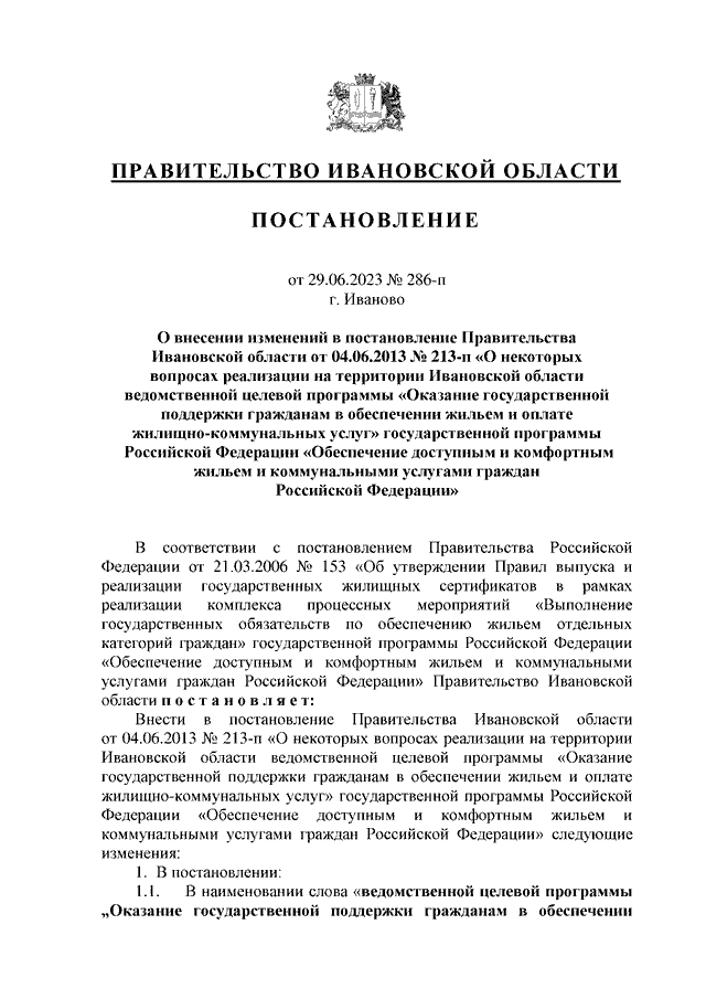 Постановление Правительства Ивановской области от 29.06.2023 N 286-п "О внесении изменений в постановление Правительства Ивановской области от 04.06.2013 N 213-п "О некоторых вопросах реализации на территории Ивановской области ведомственной целевой программы "Оказание государственной поддержки гражданам в обеспечении жильем и оплате жилищно-коммунальных услуг" государственной программы Российской Федерации "Обеспечение доступным и комфортным жильем и коммунальными услугами граждан Российской Федерации"