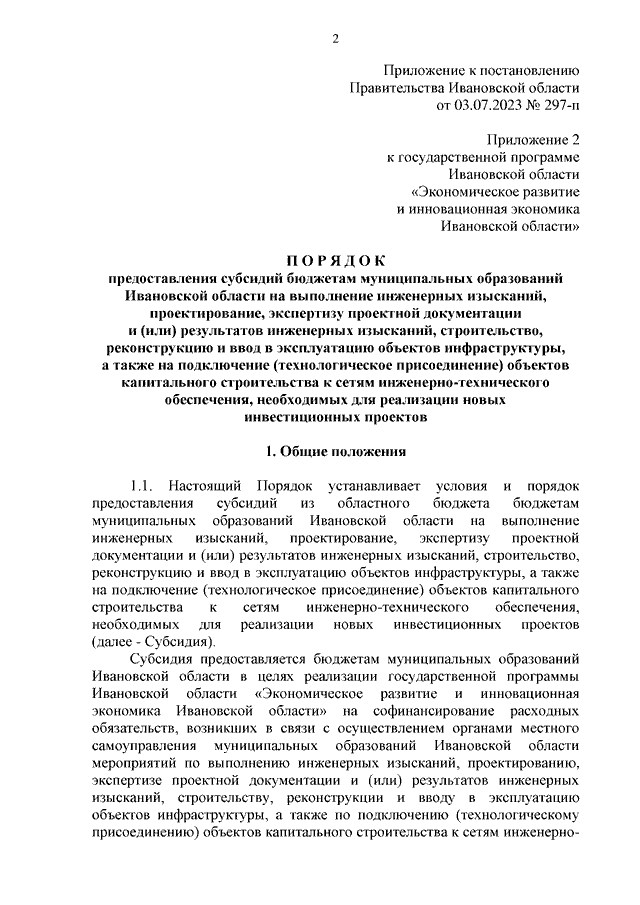 Постановление Правительства Ивановской области от 03.07.2023 N 297-п "О внесении изменения в постановление Правительства Ивановской области от 13.11.2013 N 459-п "Об утверждении государственной программы Ивановской области "Экономическое развитие и инновационная экономика Ивановской области" (вместе с "Порядком предоставления субсидий бюджетам муниципальных образований Ивановской области на выполнение инженерных изысканий, проектирование, экспертизу проектной документации и (или) результатов инженерных изысканий, строительство, реконструкцию и ввод в эксплуатацию объектов инфраструктуры, а также на подключение (технологическое присоединение) объектов капитального строительства к сетям инженерно-технического обеспечения, необходимых для реализации новых инвестиционных проектов")